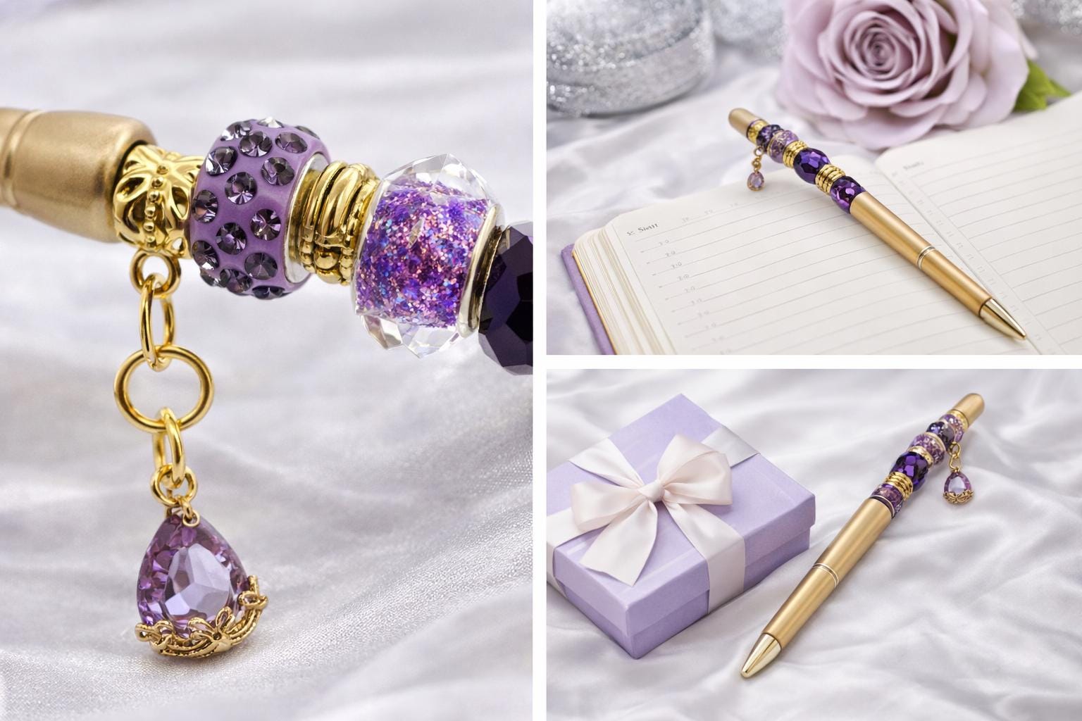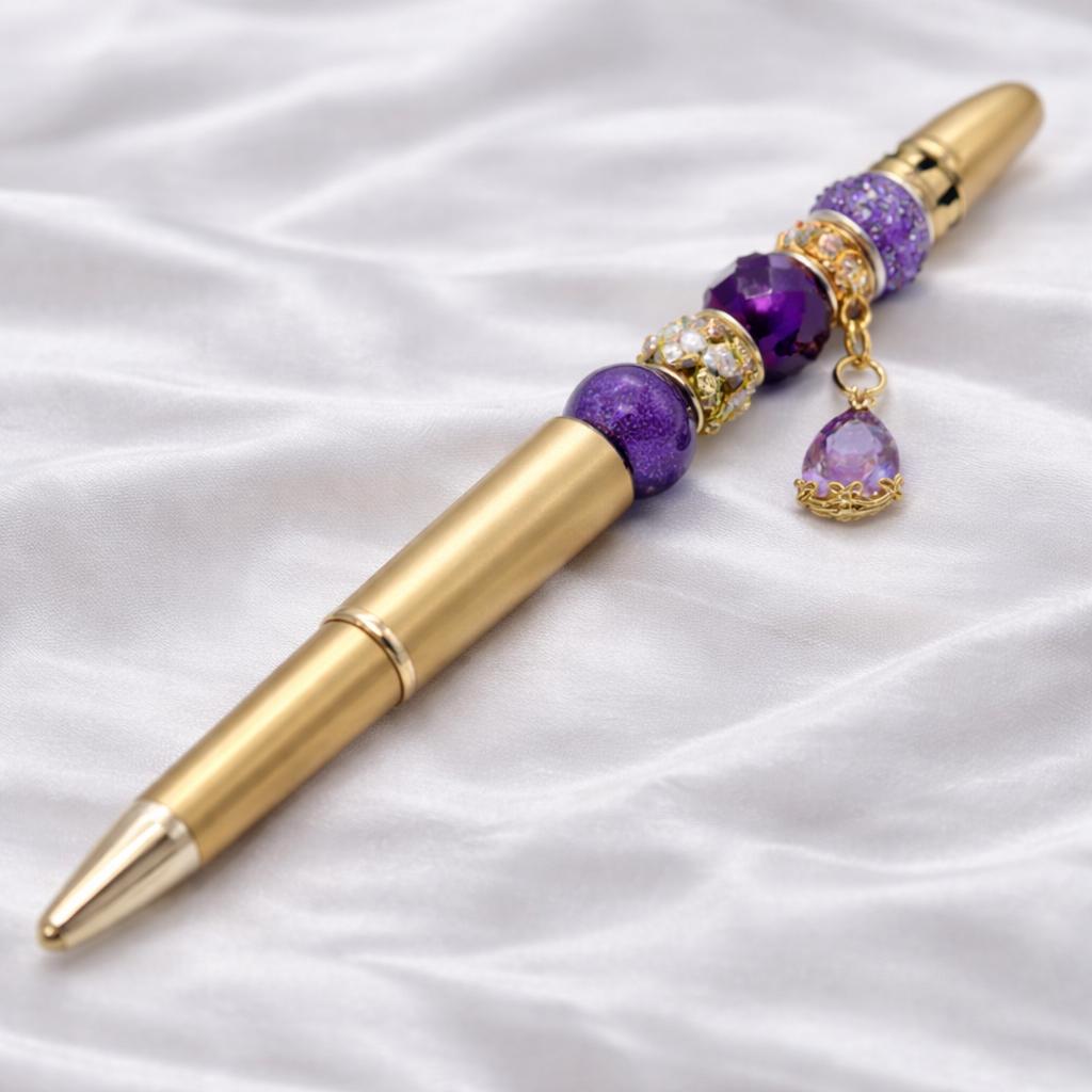 Add a touch of luxury to your everyday writing with this handmade purple beaded charm pen.
