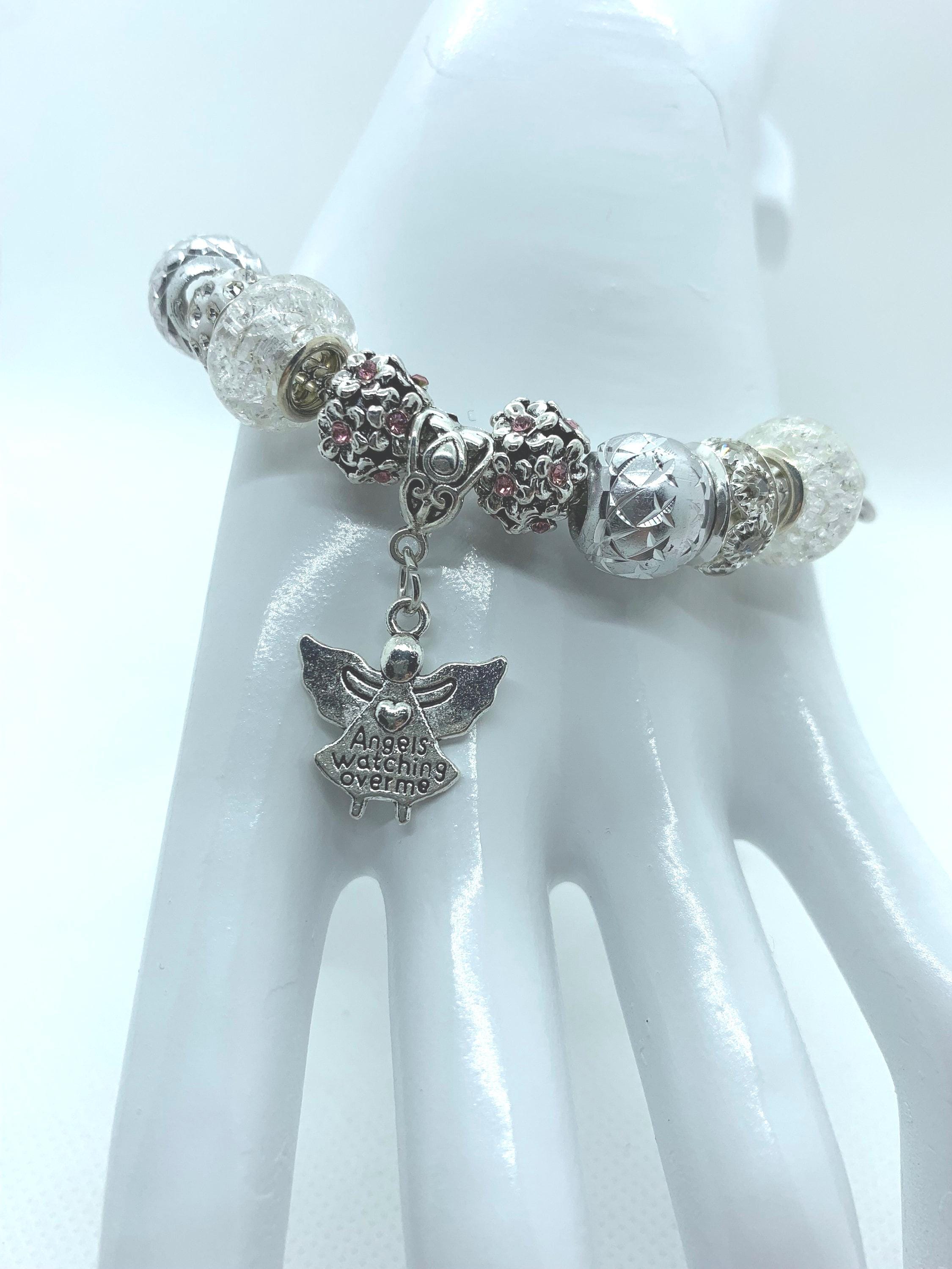 Exquisite beaded and bejeweled religious gift set including necklace w/ crucifix charm, bracelet w/angel charm & writing pen w/FAITH charm. Finest crystals, rhinestones and assorted glass beads. Necklace & bracelet are adjustable. pen comes with a refill. Set comes with a beautiful organza drawstring pouch.. Styles may vary slightly.