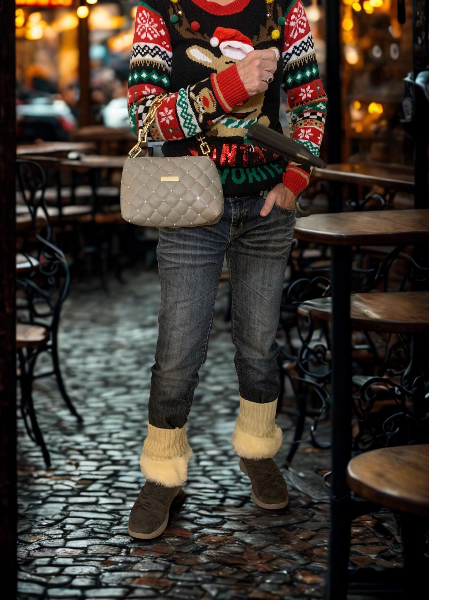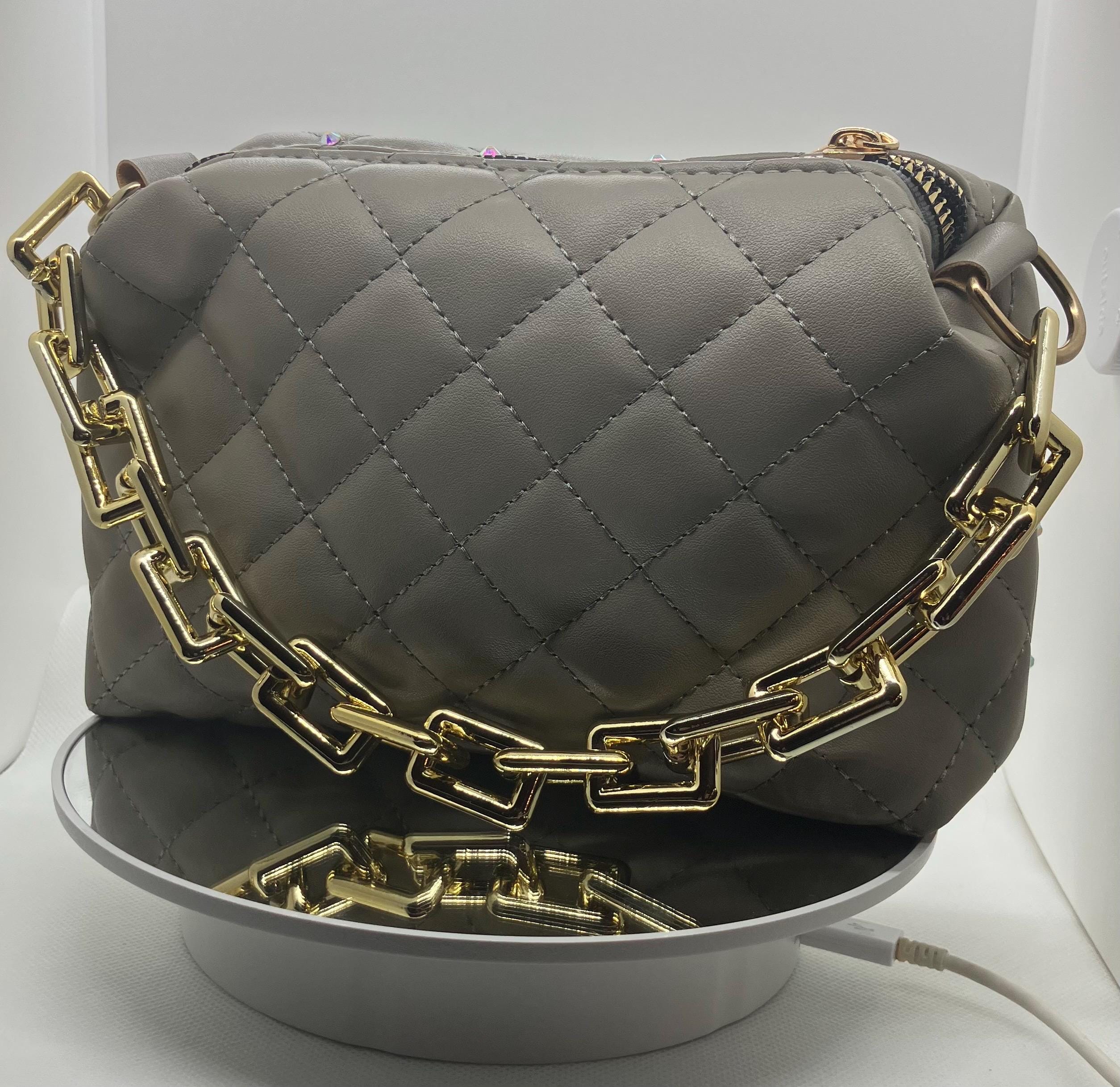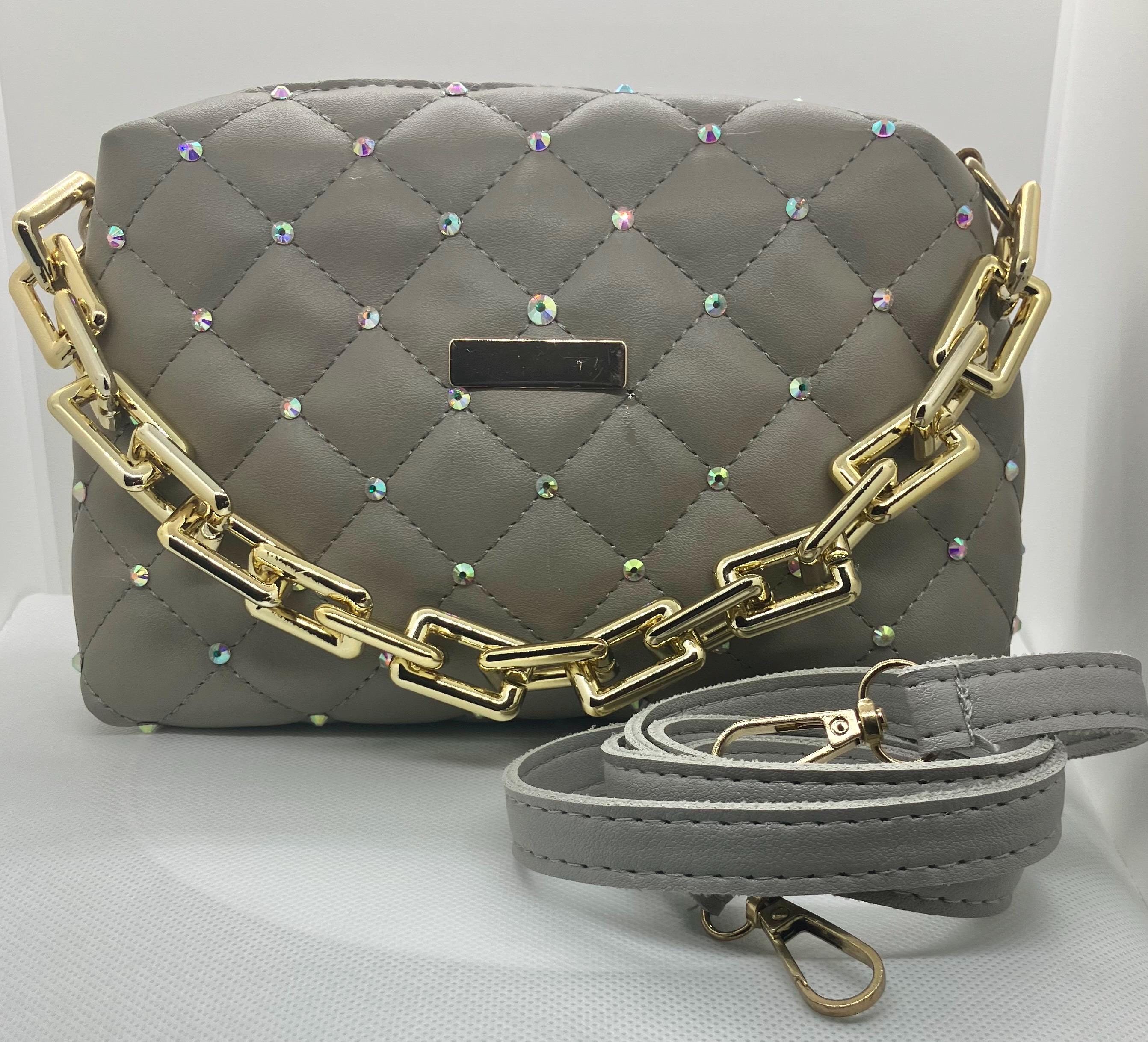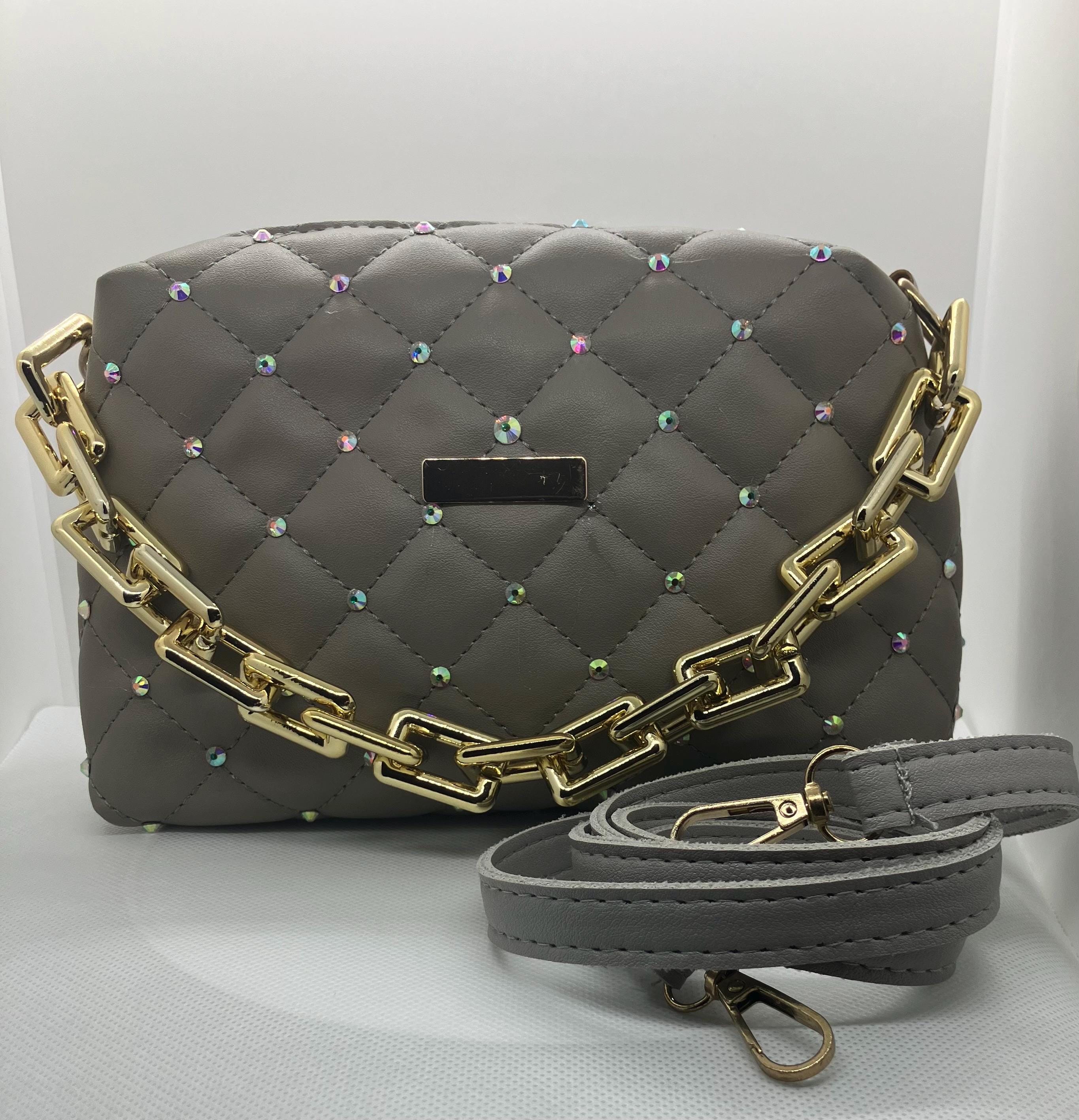 Chunky chain top handle plus shoulder strap. Mini packet of extra rhinestones tucked away inside. Closes by zipper.