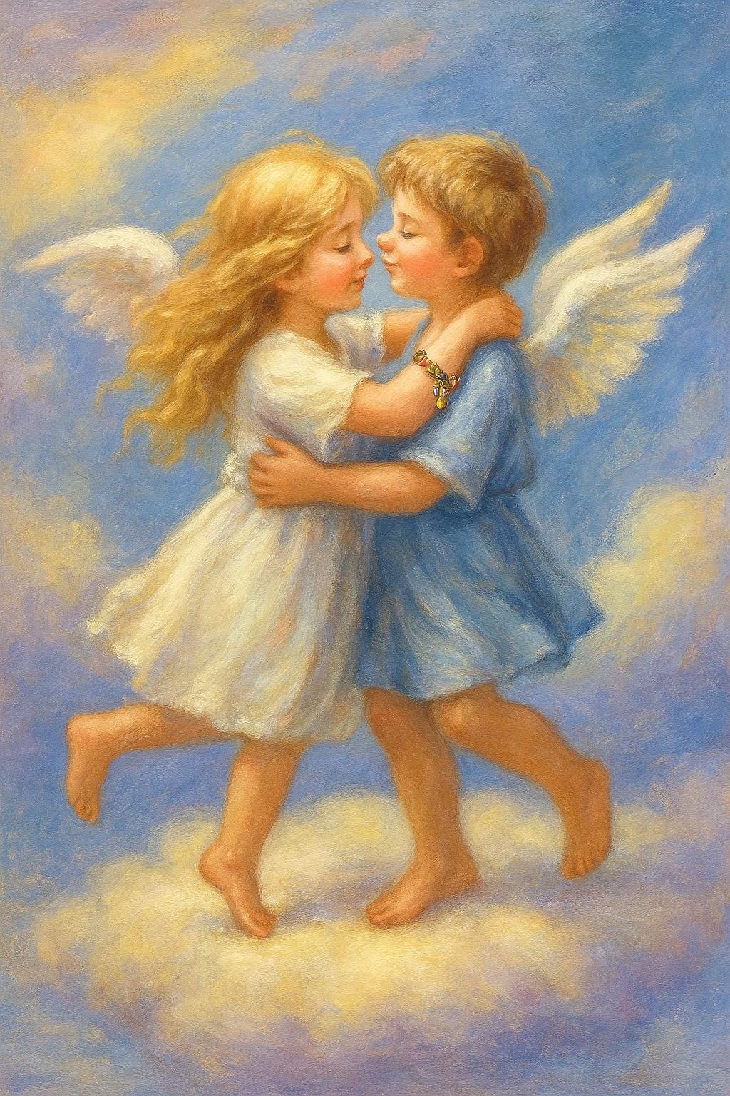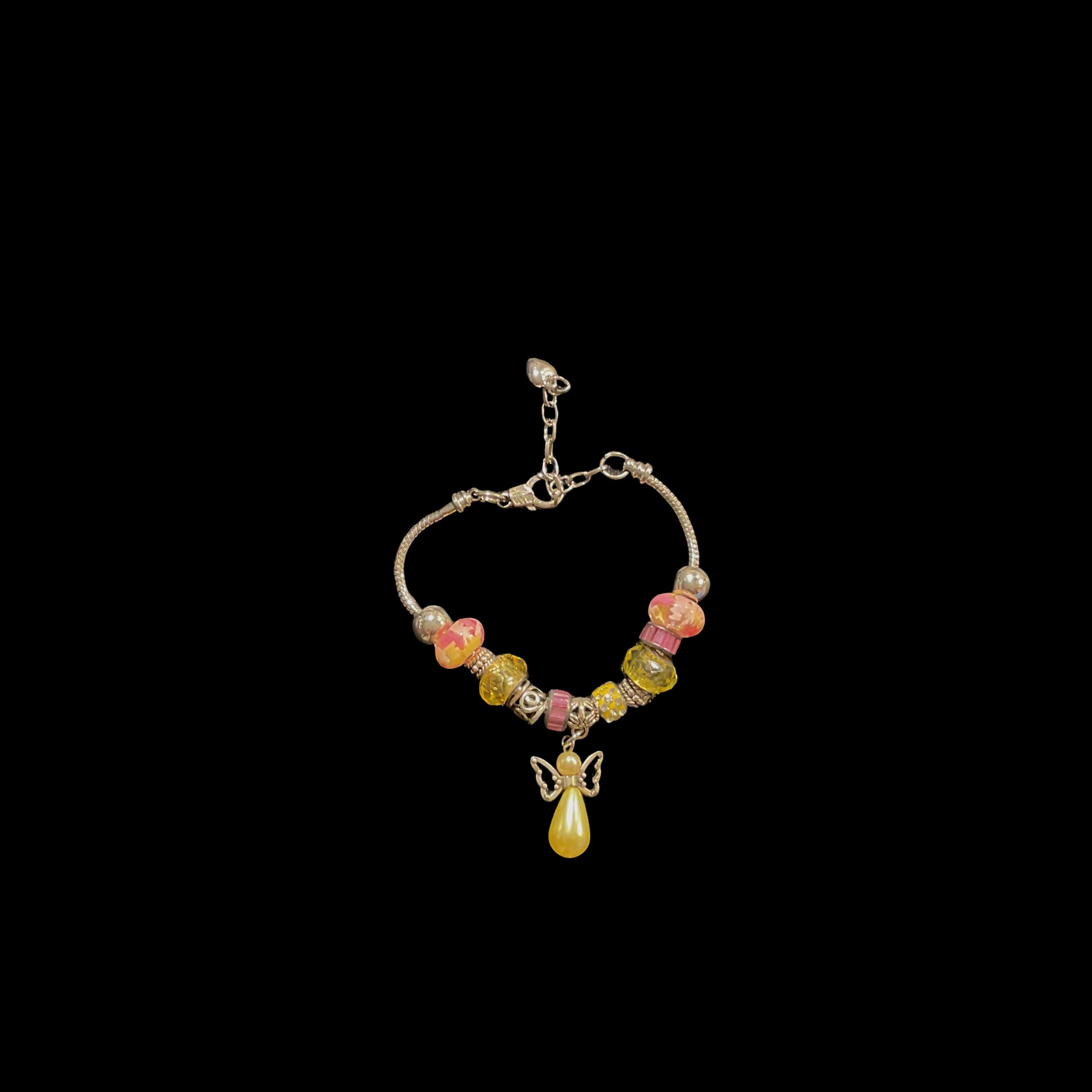At the center, there’s a dangling angel charm made of a yellow teardrop bead for the body and silver-tone metal wings, adding a whimsical and spiritual touch. The overall style is vibrant, feminine, and playful, with a handcrafted, personalized aesthetic.