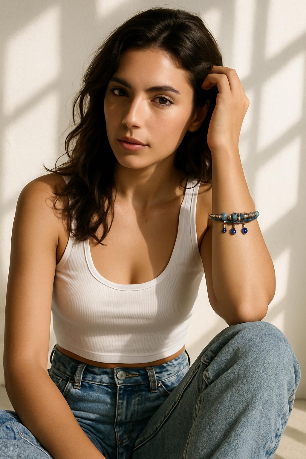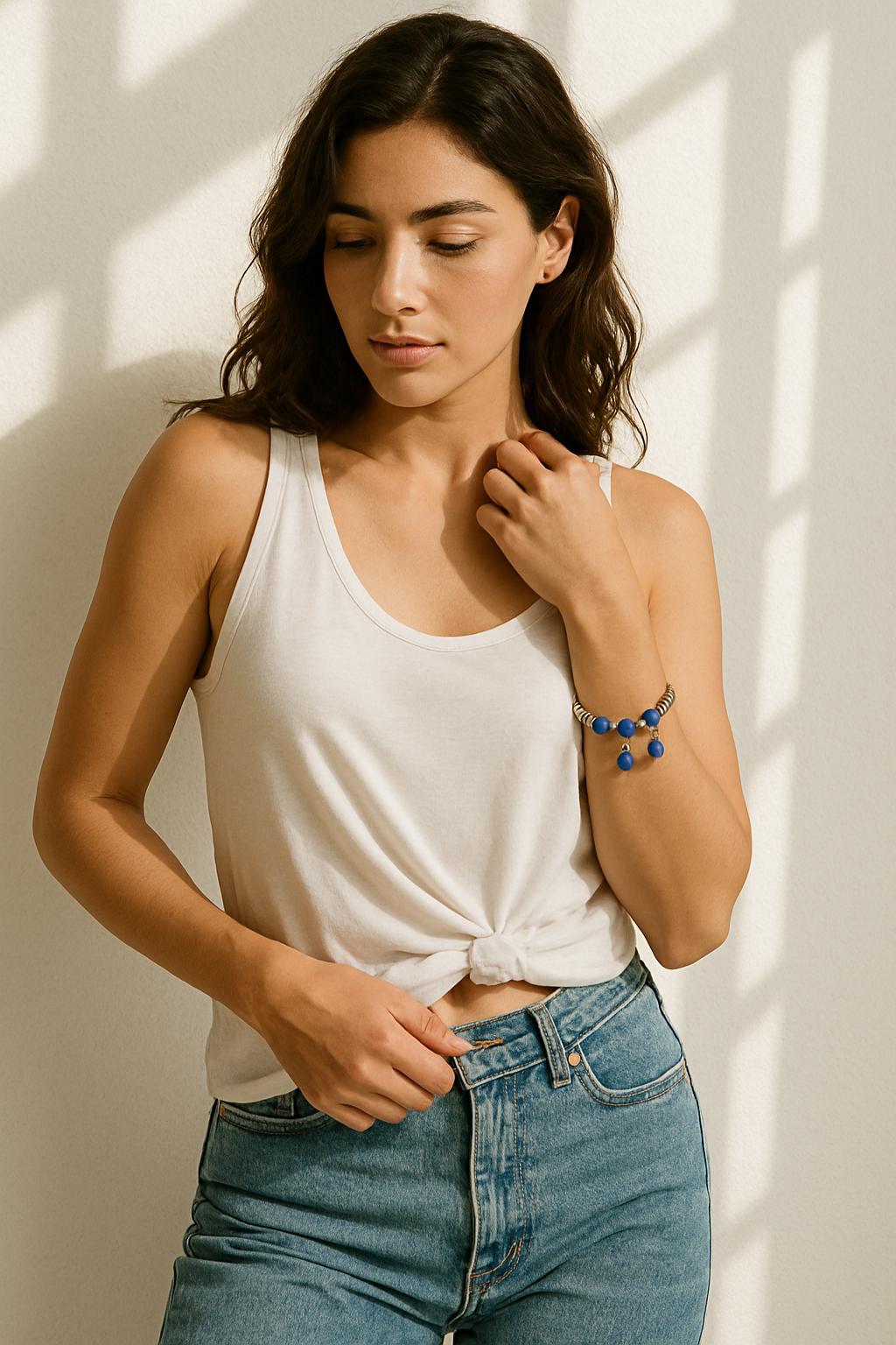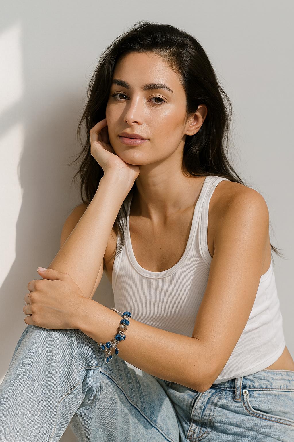 Bring elegance and sparkle to your style with this handmade blue charm bracelet featuring dazzling crystal teardrop pendants and sapphire-toned beads. This bracelet is designed with attention to detail, showcasing a silver-toned bangle adorned with a harmonious mix of faceted and iridescent beads, making it perfect for any occasion—from casual chic to evening glam.