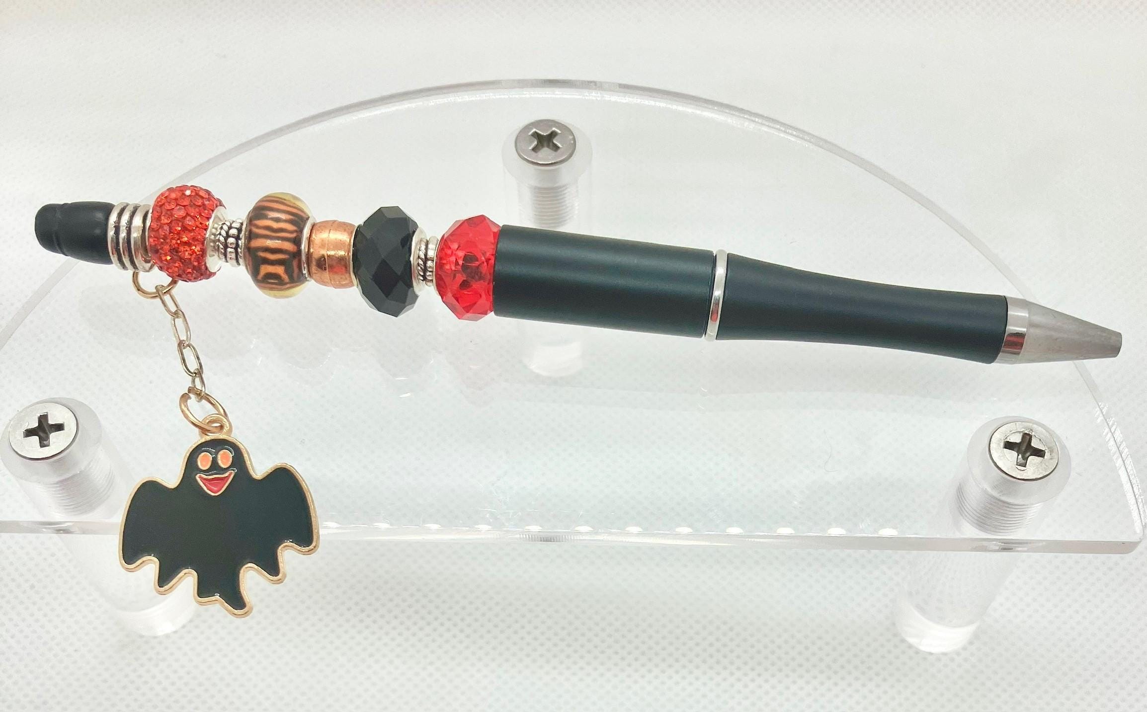 The matching refillable pen is dressed with coordinating beads—deep black, fiery red, and bold metallic tones—topped with a dangling bat charm that perfectly ties the set together. Functional and stylish, this pen is ideal for journaling, note-taking, or simply adding a bit of seasonal personality to your desk.