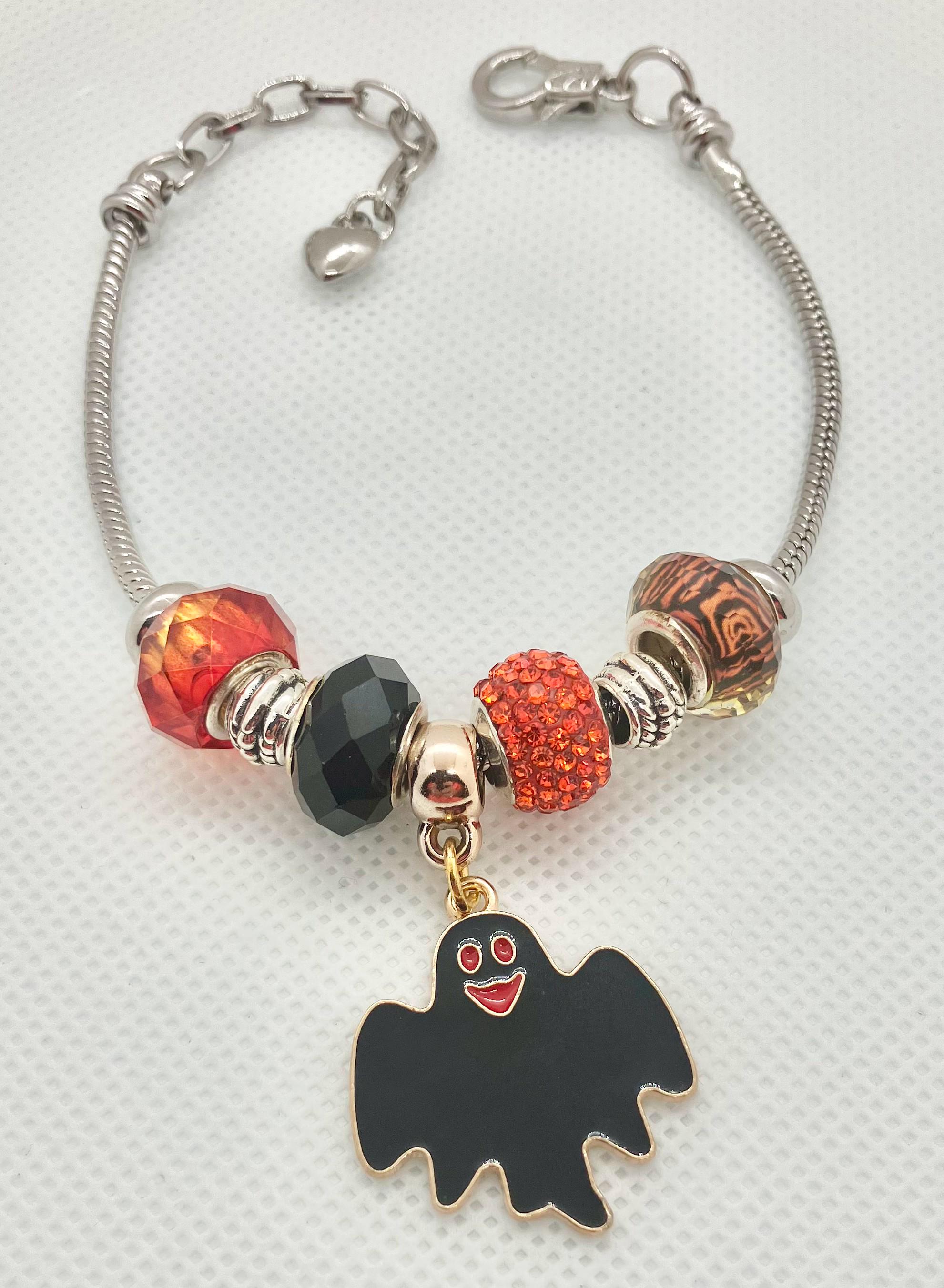 The bracelet features a mix of vibrant orange, sparkling red rhinestone, and faceted black glass beads, accented with unique patterned beads and finished with a playful black bat charm. Designed with a sturdy silver-tone snake chain, it’s lightweight yet durable, making it the perfect piece to wear for Halloween parties or to add a little fun flair to your fall outfits.