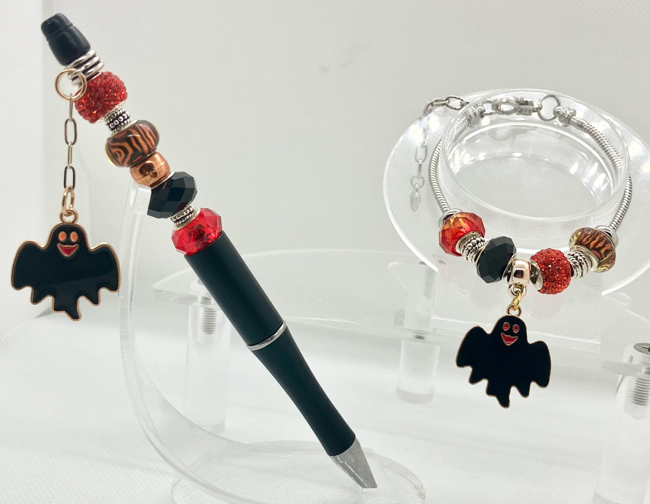 Celebrate spooky season in style with this handmade Halloween bracelet and pen set, crafted with care to bring a festive touch to your everyday accessories.