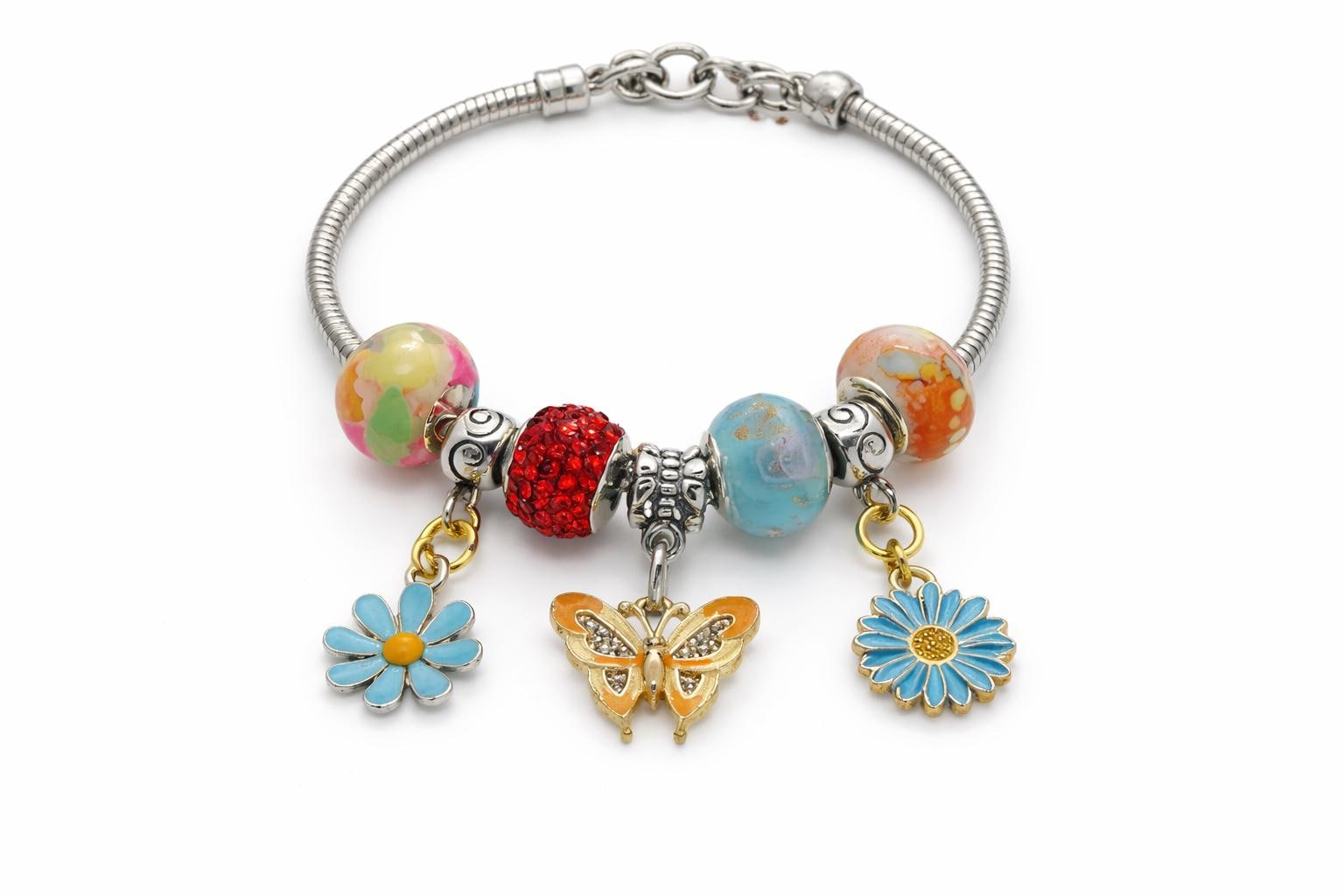 Add a touch of sunshine to your day! This handmade bracelet features a golden butterfly and blue daisy charms with vibrant artisan beads. Perfect boho gift for her 🌸
