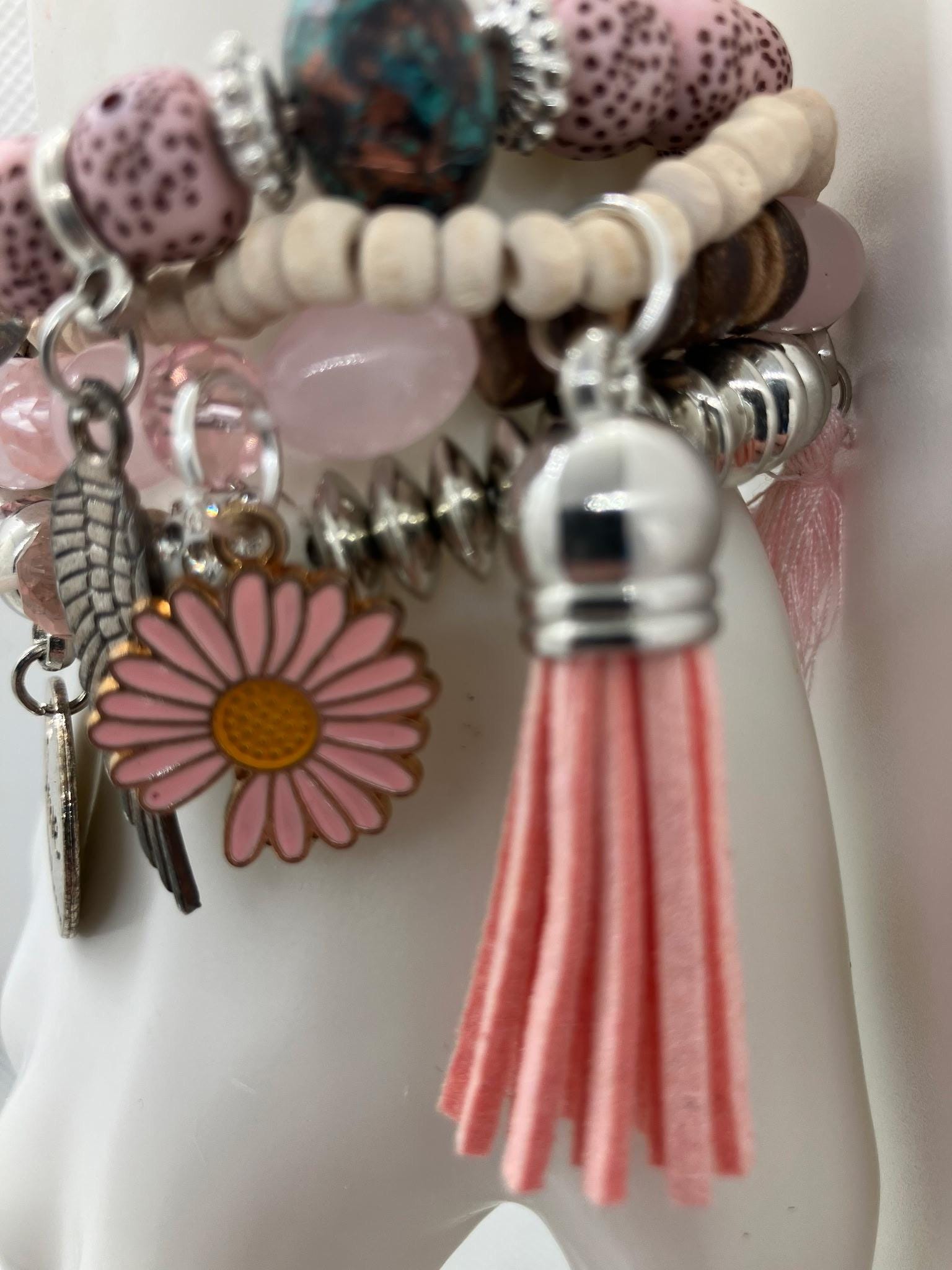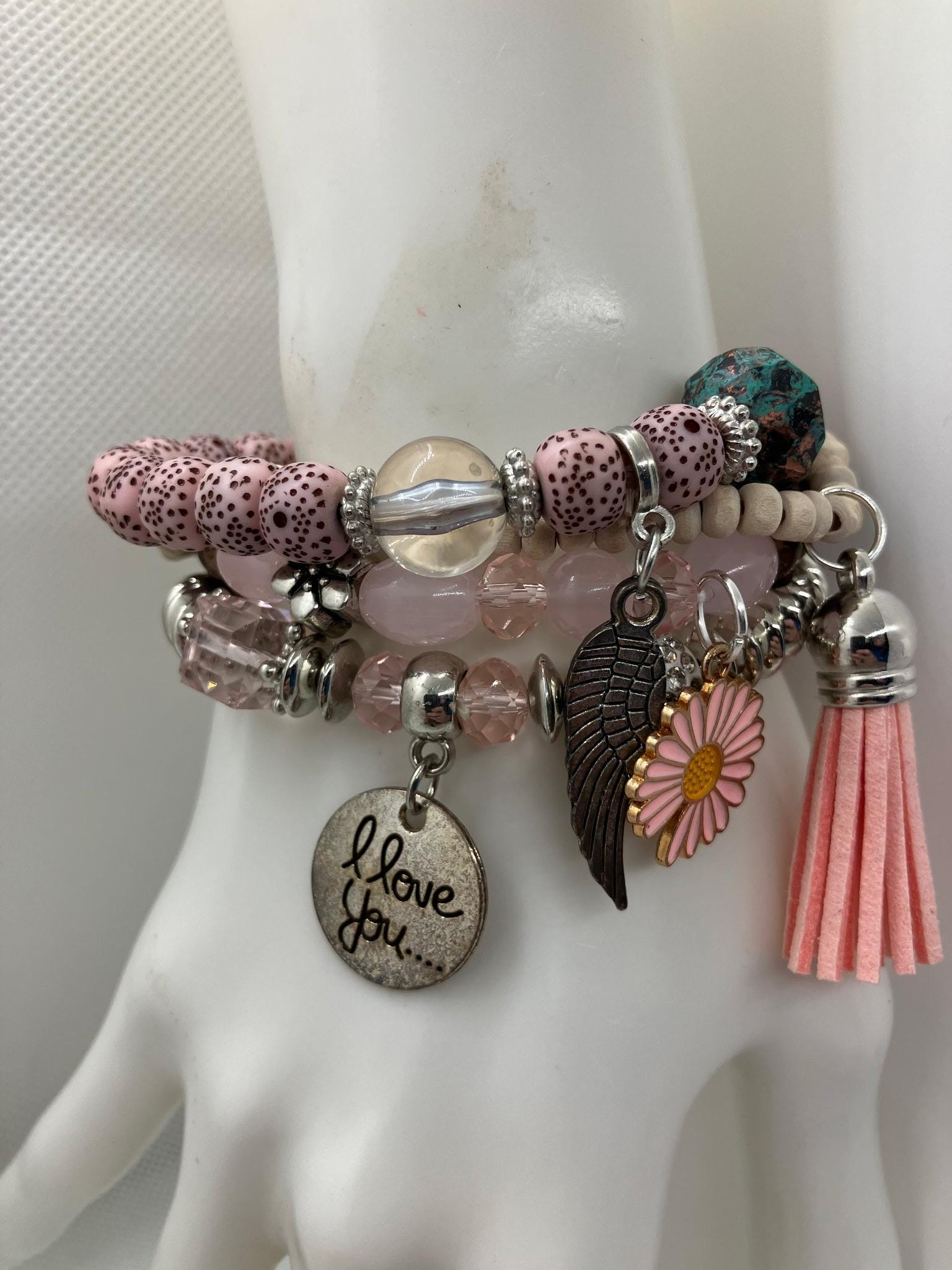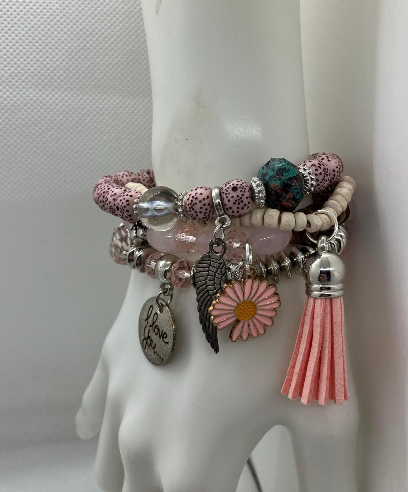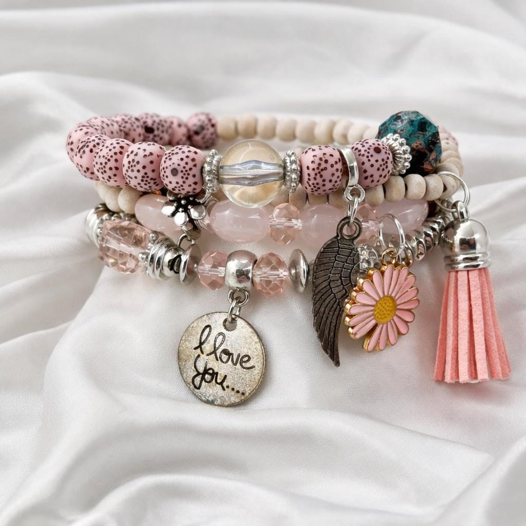 This beautiful handmade pink beaded stretch bracelet set is designed with soft blush tones, sparkling faceted beads, and a stylish mix of charms- perfect for everyday wear or gifting someone special. The bracelet features four unique charms: Engraved tag reading “I love you”, Antique silver angel wing, Pink daisy flower charm, Soft pink tassel accent. Each bead and charm is carefully selected to create a feminine, meaningful piece that pairs beautifully with casual outfits, dressy looks, or stacked bracelets.