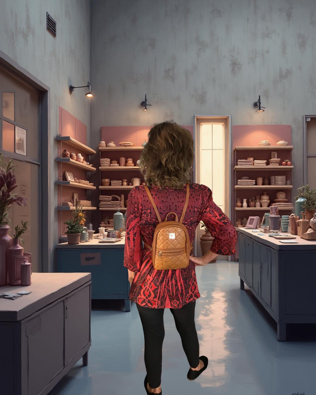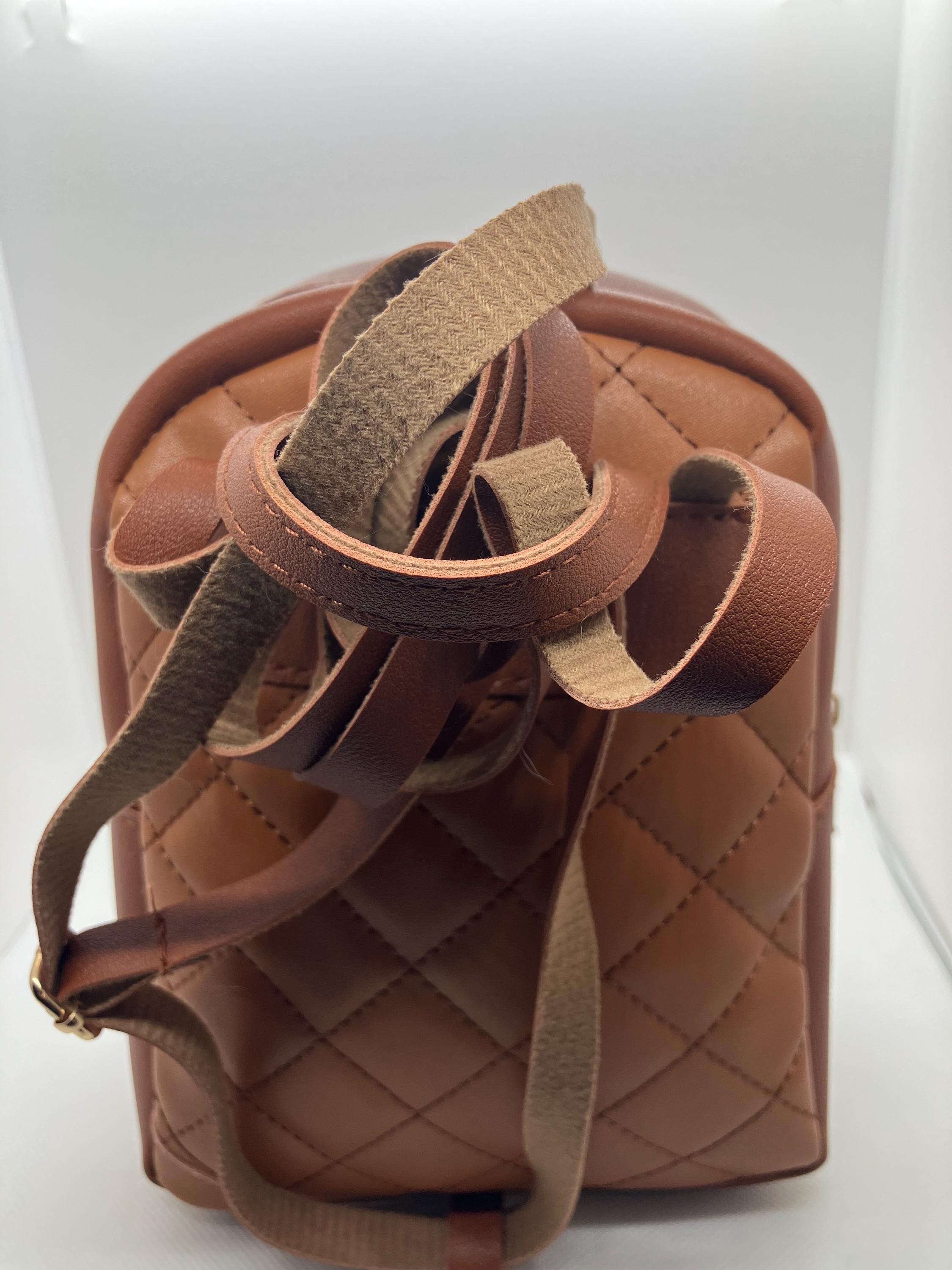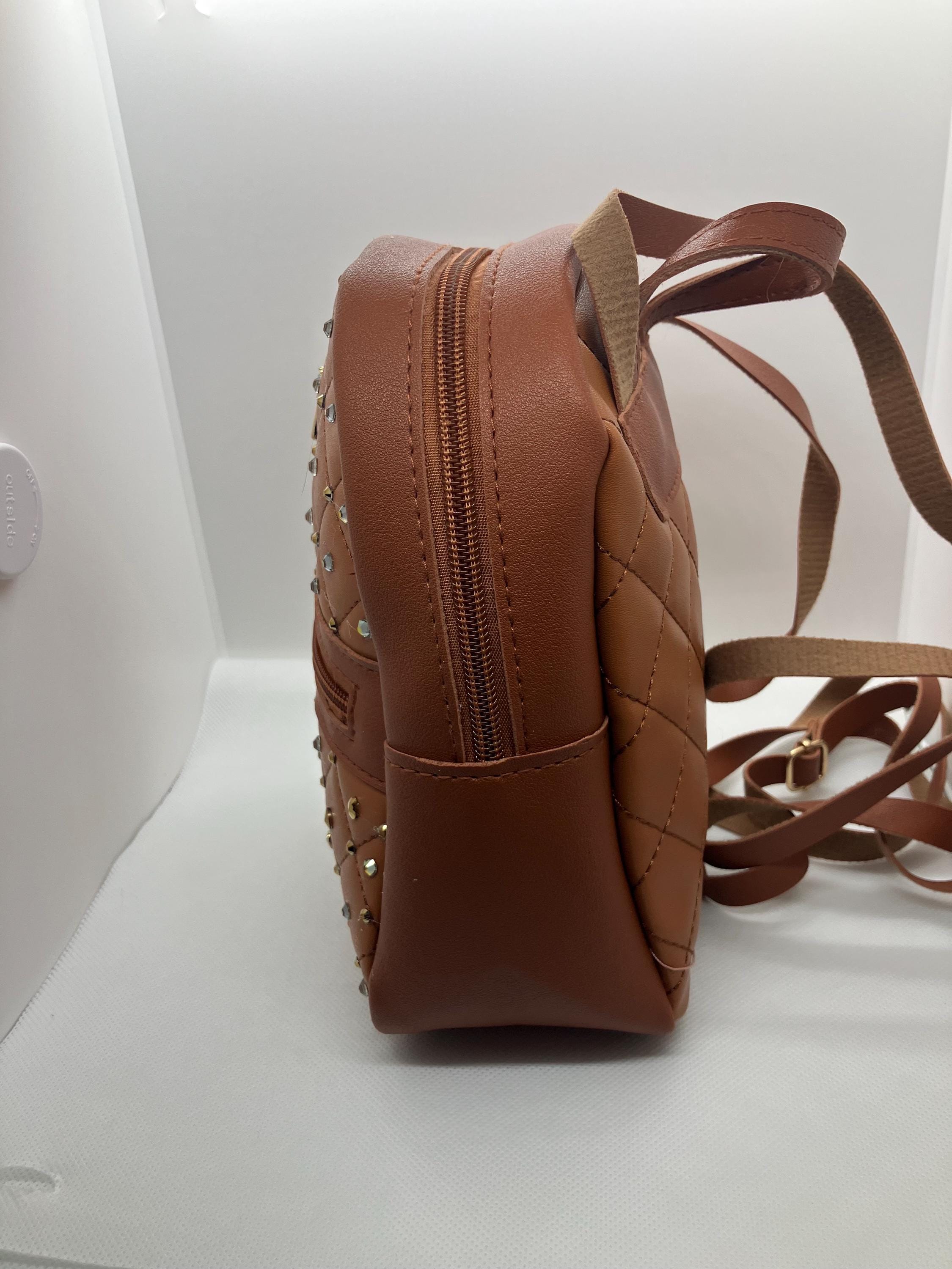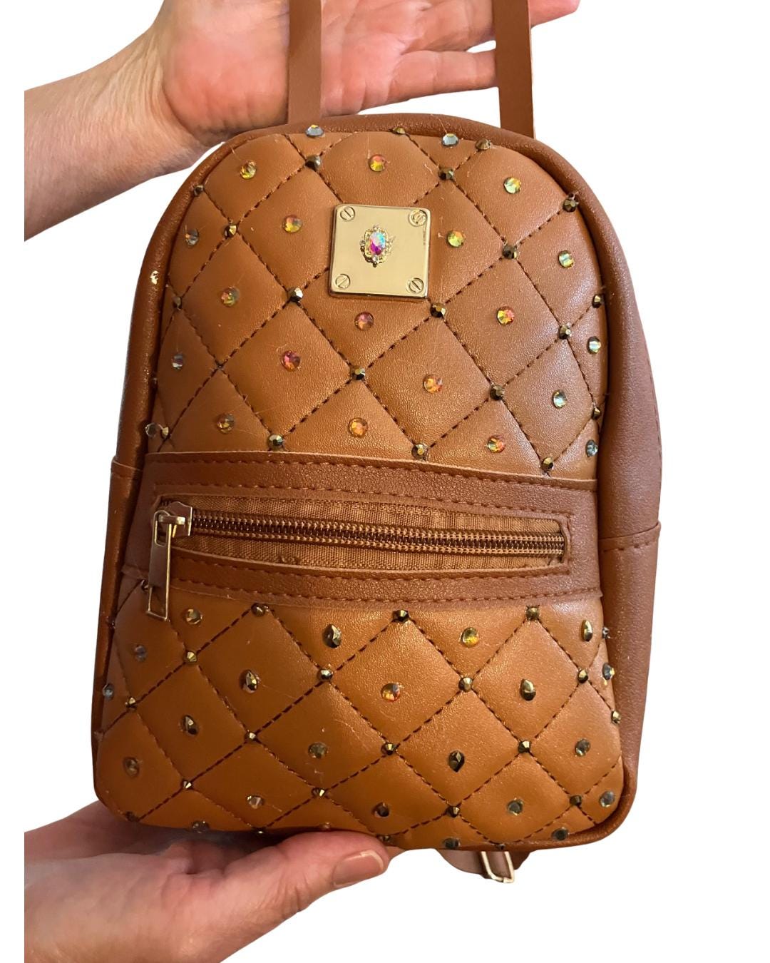 Front horizontal zipper with gold pull, front side includes aurora rhinestone studs, adjustable strap, mini packet of extra aurora rhinestone studs tucked inside.