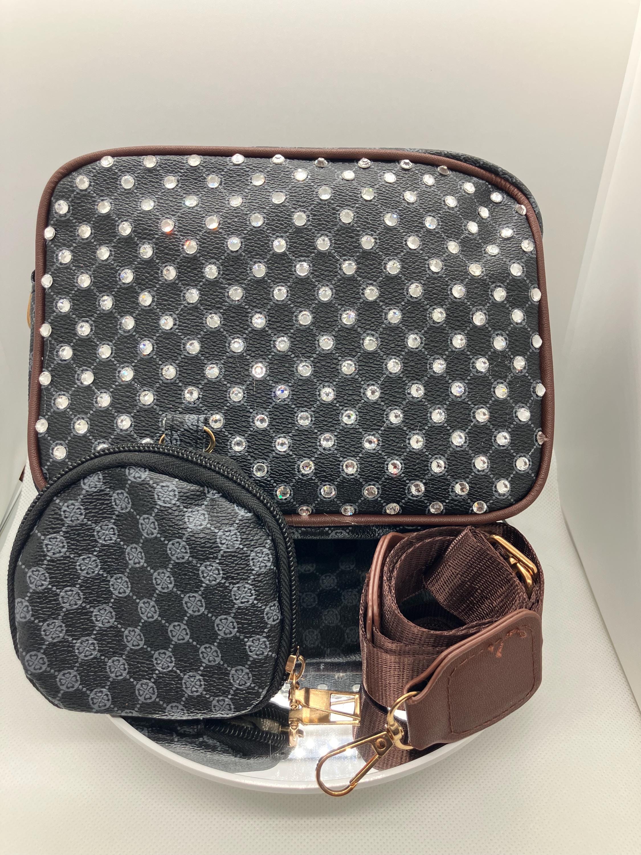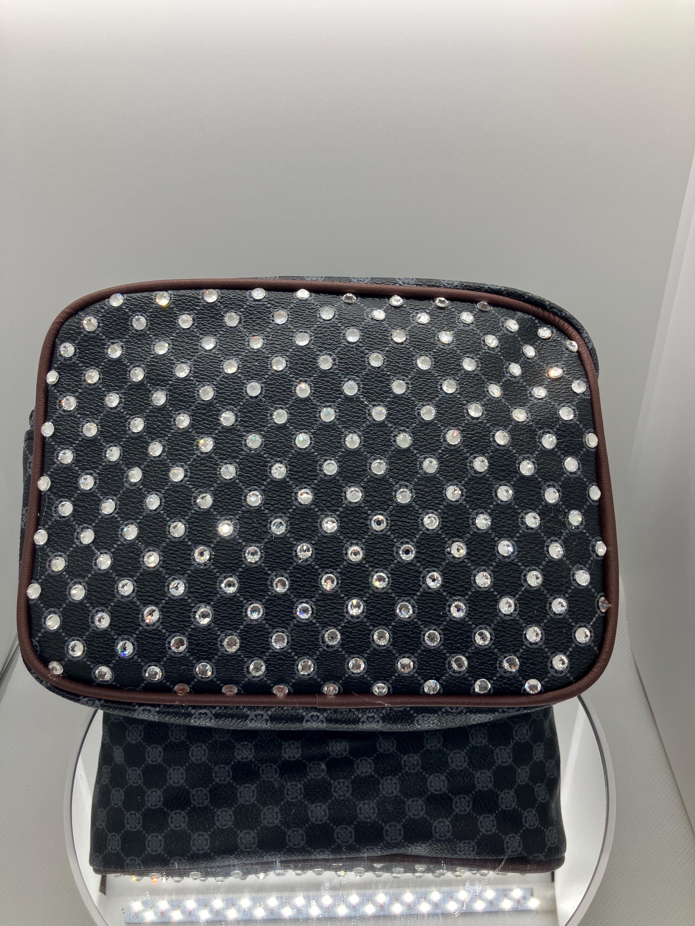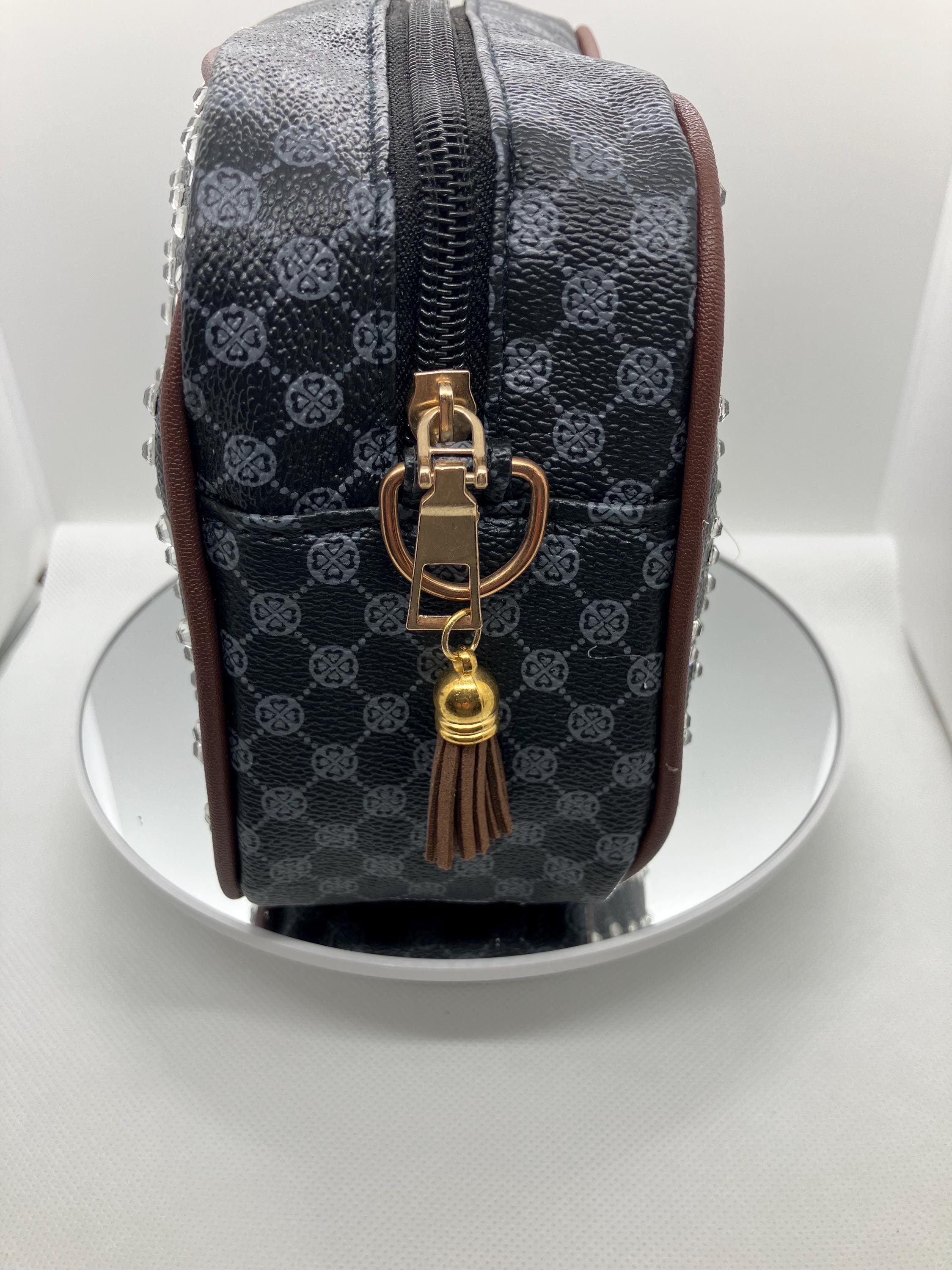 Mini packet of extra rhinestones tucked away inside. Closes by zipper with faux leather tassel.